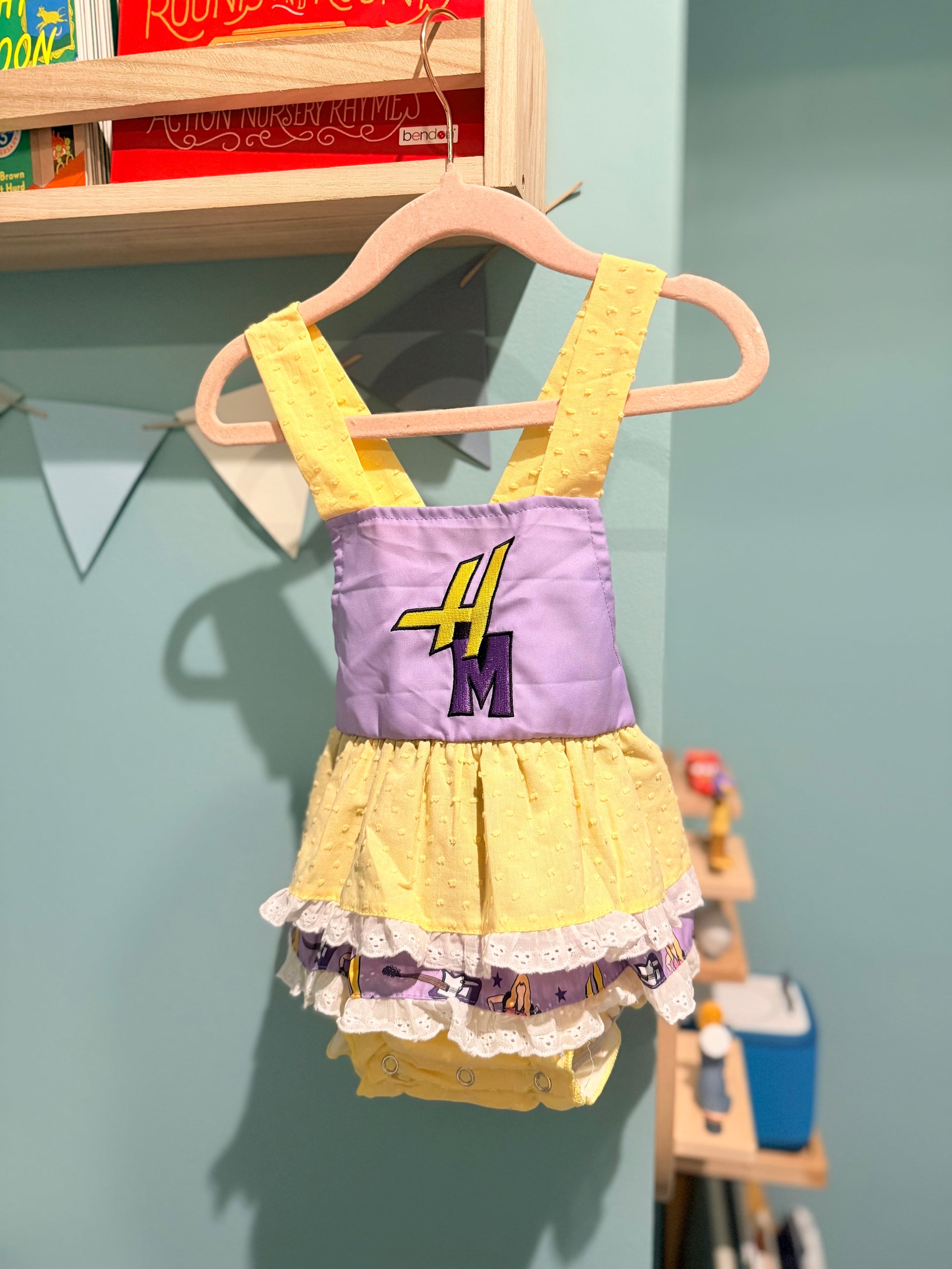 The embroidered initial detail on the bodice adds a fun popstar touch, while the crossed back straps and bubble silhouette keep it comfortable and easy to wear. Finished with snap closures for quick diaper changes, it’s as practical as it is adorable.